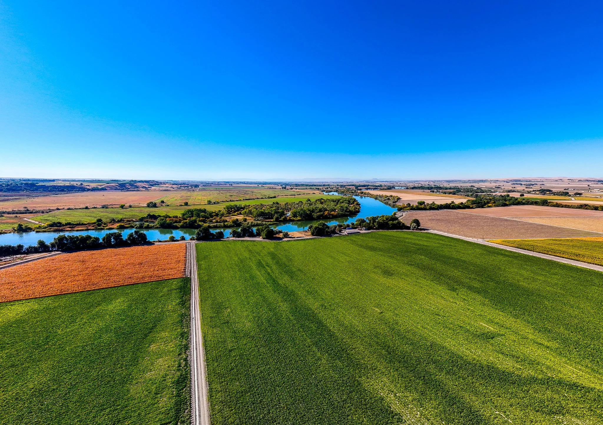 A scenic aerial view of agricultural fields and a winding river under a clear blue sky.